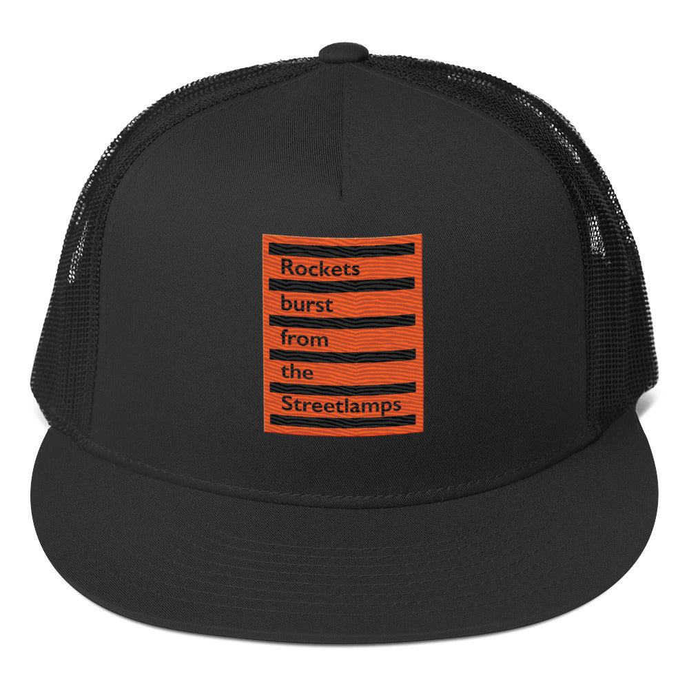 Rockets Burst from the Streetlamps Orange Sticker Trucker Cap