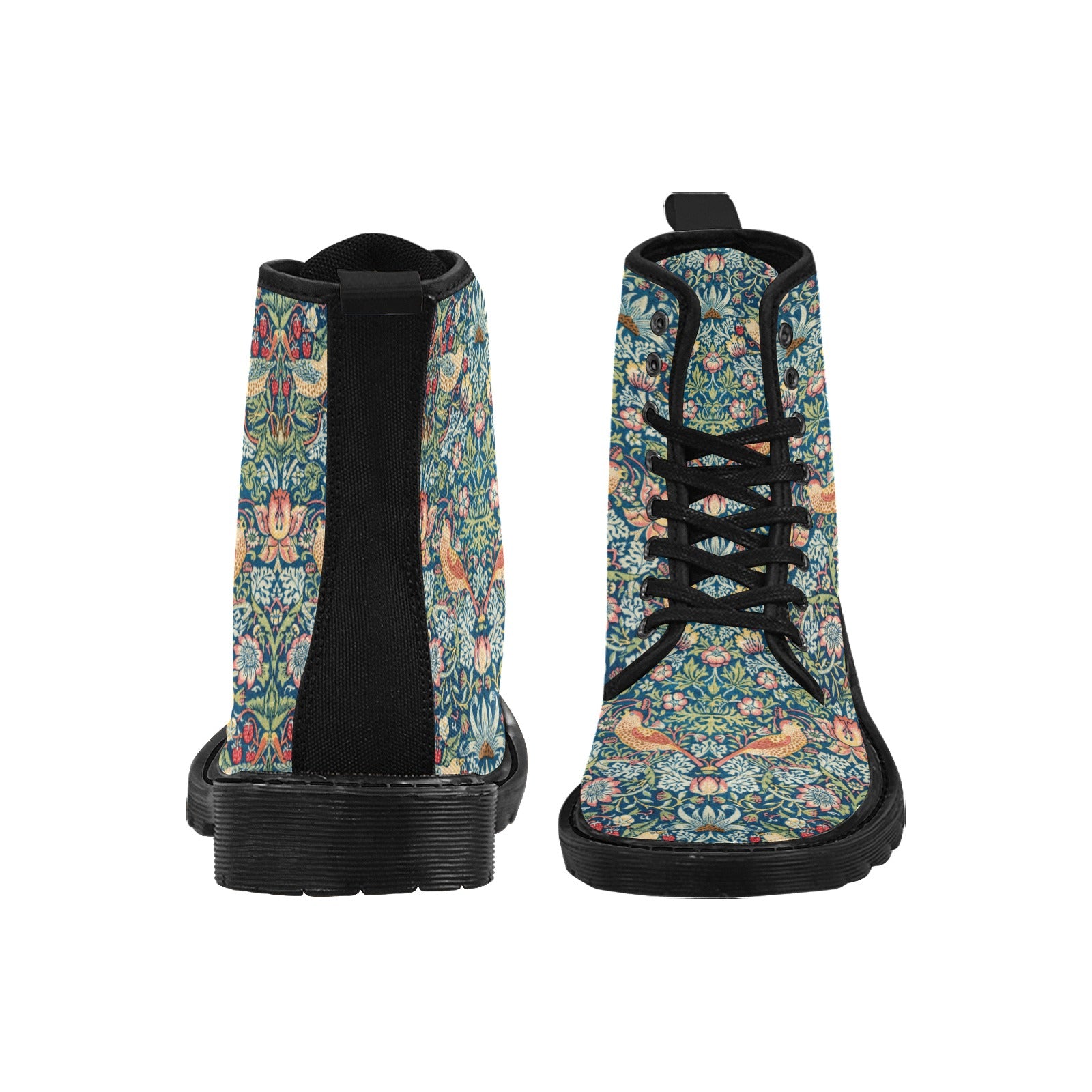 These canvas combat boots sport an all over pattern called Strawberry Thief by Victorian designer and polymath William Morris. This textile design with its stylized birds and strawberries has become an icon of Morris’s designs and a great example of the delight that the Arts and Crafts artists infused in their work.