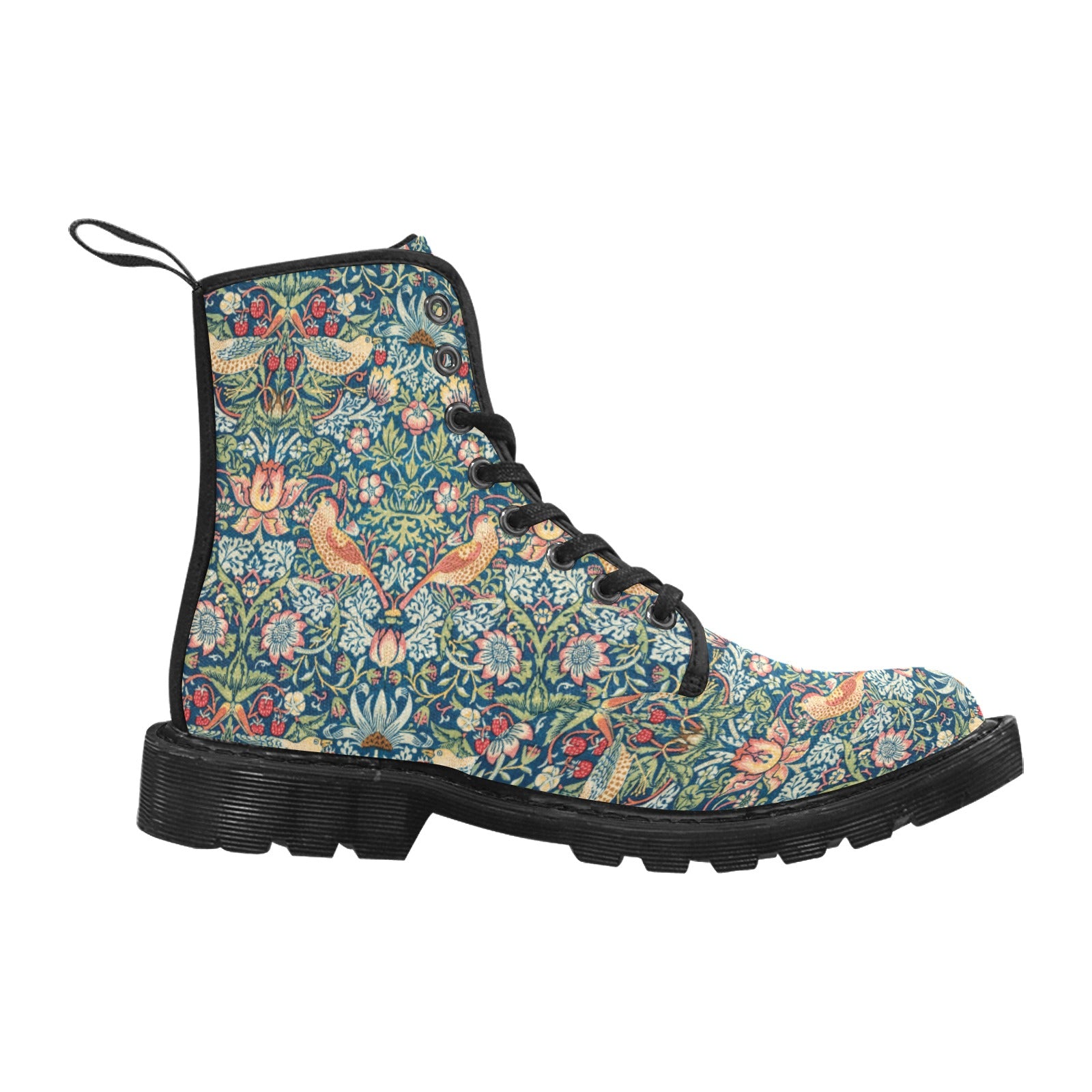 These canvas combat boots sport an all over pattern called Strawberry Thief by Victorian designer and polymath William Morris. This textile design with its stylized birds and strawberries has become an icon of Morris’s designs and a great example of the delight that the Arts and Crafts artists infused in their work.